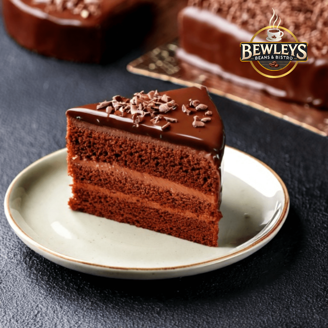 A moist and rich chocolate sponge cake slice, layered with silky chocolate ganache for a deep, decadent cocoa experience in every bite.