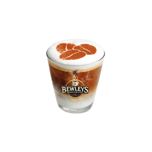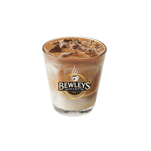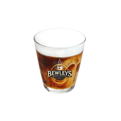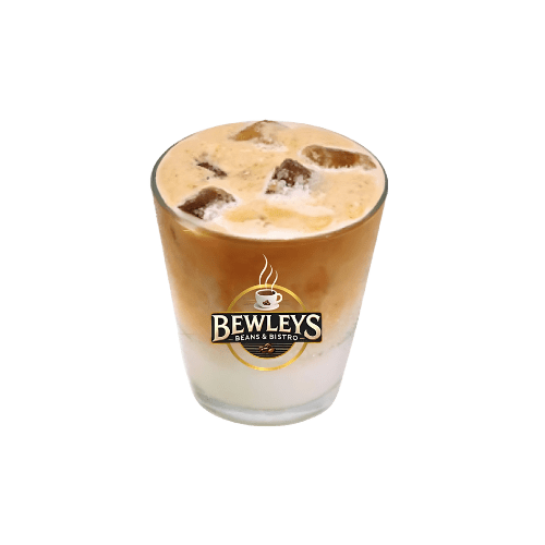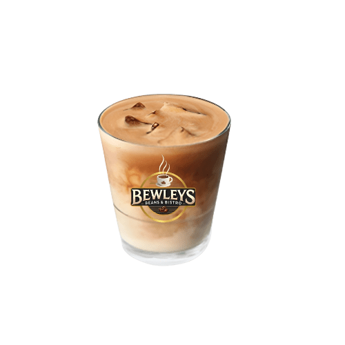A smooth and creamy iced flat white, featuring rich espresso and chilled, velvety milk poured over ice for a refreshing coffee experience.